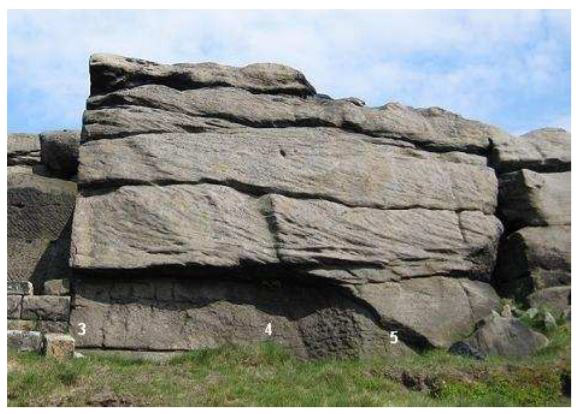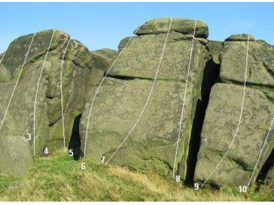 Approach: from Dovestones Reservoir car park (pay and display - strictly policed) follow the track round the right hand side of the reservoir, past the sailing club hut until a bridge is reached. Duck Stones proper is the collection of tors and small crags on the skyline directly up the hillside across from the bridge, just to the right of the dry stone wall higher up the hill. To get there, take a deep breath and walk 50 yards up the tarmacked road on the other side of the bridge. Cut back left on the horizontal track between the 2 cloughs (streams) coming down the hillside, cross the small iron grille bridge. Just beyond this a path strikes directly up the hill, until it meets the dry stone wall which can be followed to the mid point of the boulders described. The first described problems are at Bramley's Cot, which can be reached by following the moor edge path left or north until it drops down to the ruined building nestled against the crag. Approx 30 minutes.