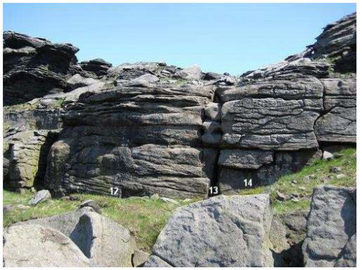 Bramley's Cot (GR026035) can be found half way between Duckstones proper and Dovestones Edge. It is easily recognised by the ruined building which nestles into the edge and from which it takes its name. The first problems described follow the roof line of the old building.