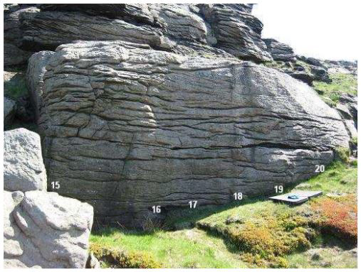 Duckstones slab can be found approximately 100 yards south along the moor edge. It is best to contour along the jumble of rocks just below the main moor edge path in order not to miss it! When you do find it, you'll probably recognise it by its golden colour and a flake on the right side.