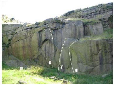 Quarry 8 can be reached in a few minutes by following the track out the left side of Quarry 2. Follow the right side of the fence as you drop down the hill until you meet an obvious horizontal track contouring the hillside. Cross the fence at the obvious point to follow the track left, Quarry 8 is the second opening on your left. The problems on the main wall are a tad highball, bring a mat and a spotter!