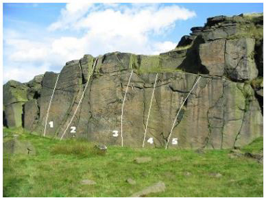 1. Nora Batty, a good problem. Finger jam the right hand crack to the arete, 6b. Descend the wall to the right.