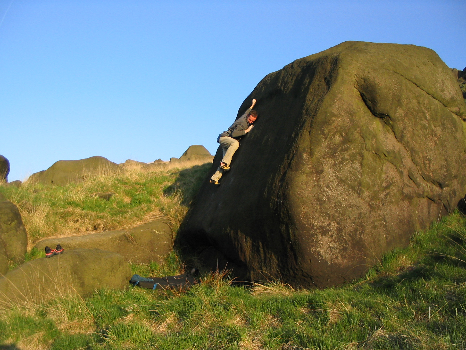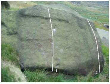 Off the beaten track but well worth seeking out. This slabby boulder lies just above the tree line on the far right side of the woods (facing uphill). Its main attraction being the excellent central line revolving around a jump into a pocket and a mantle in perfect round slopey dish.
