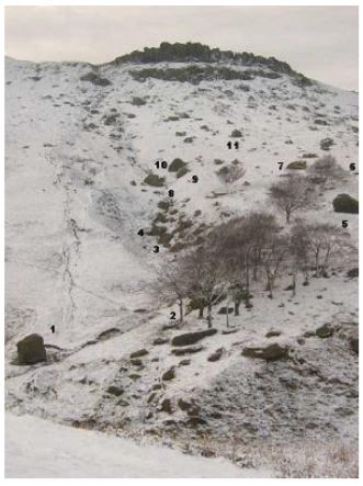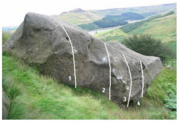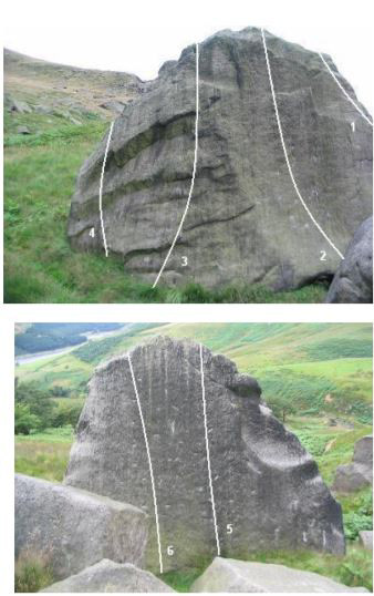 Approach: from Dovestones Reservoir car park (pay and display) follow the track round the right hand side of the reservoir, past the sailing club hut until a gate is reached. Go through the gate, keeping the woods to your right, follow the track until an opening in the wall (before the bridge) on your right reveals a path following the stream up to the first boulder, the sugar loaf. Approx 20 minutes.